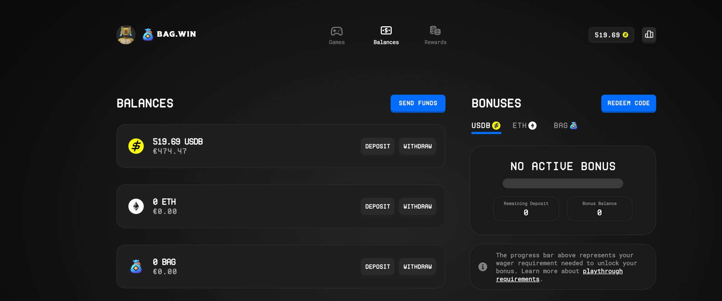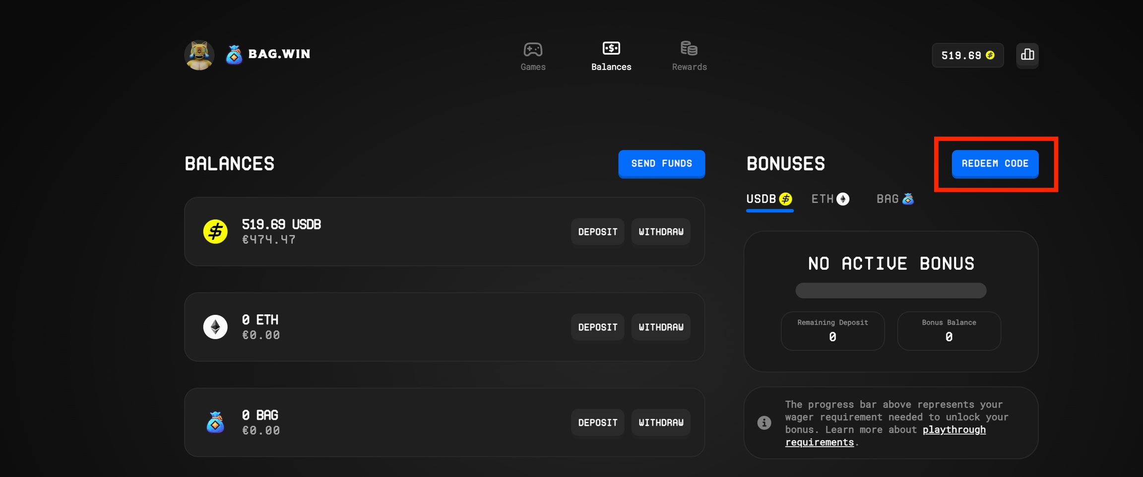 Paso 1: Inicia sesión en bag.win y cliquea Balances.