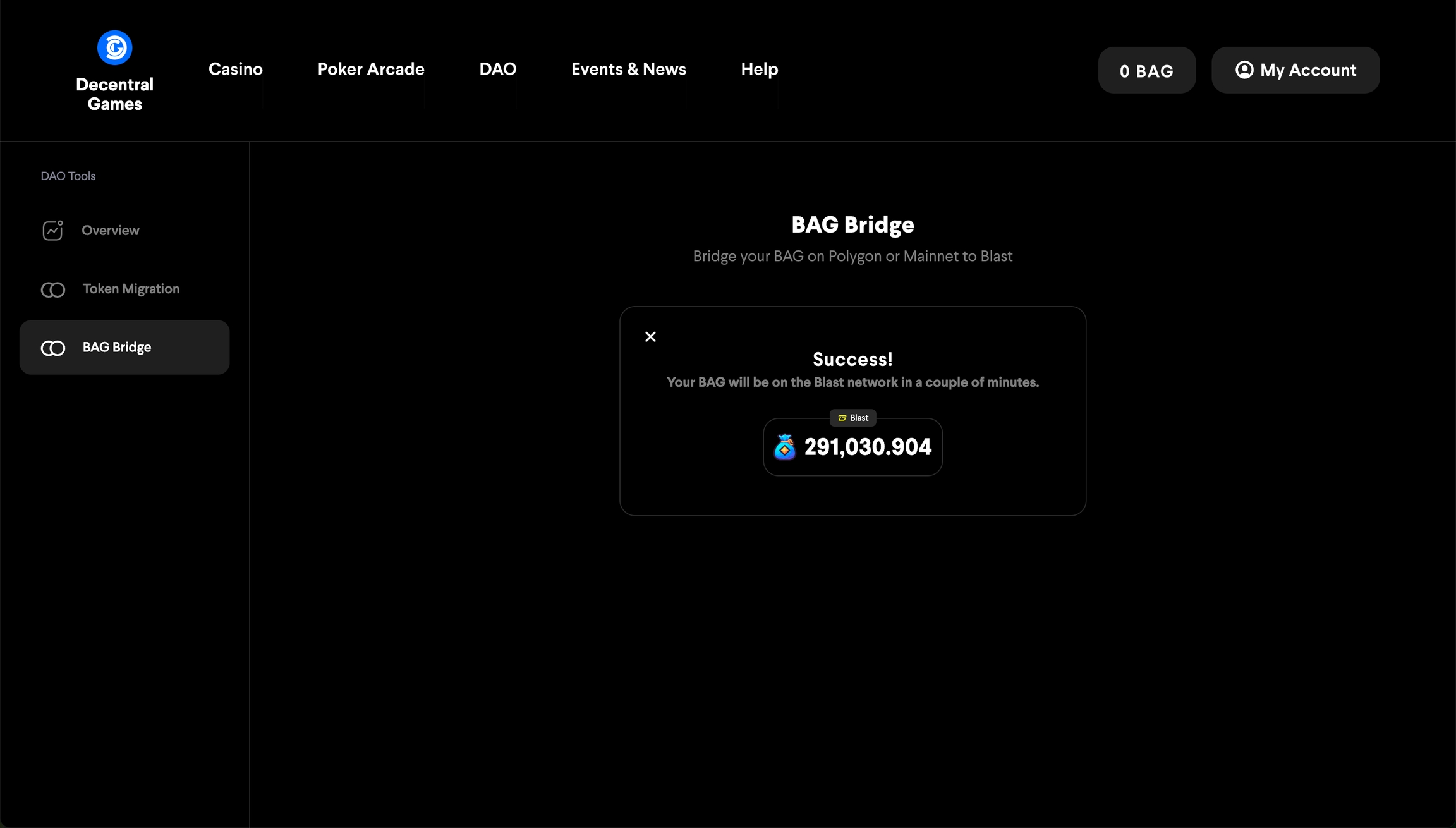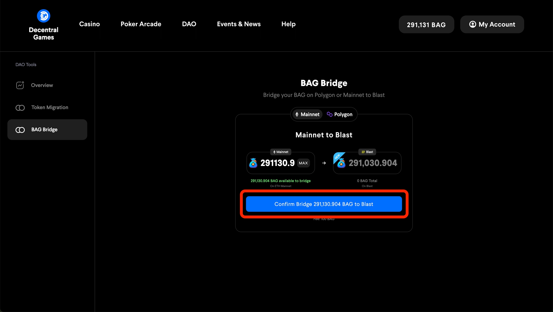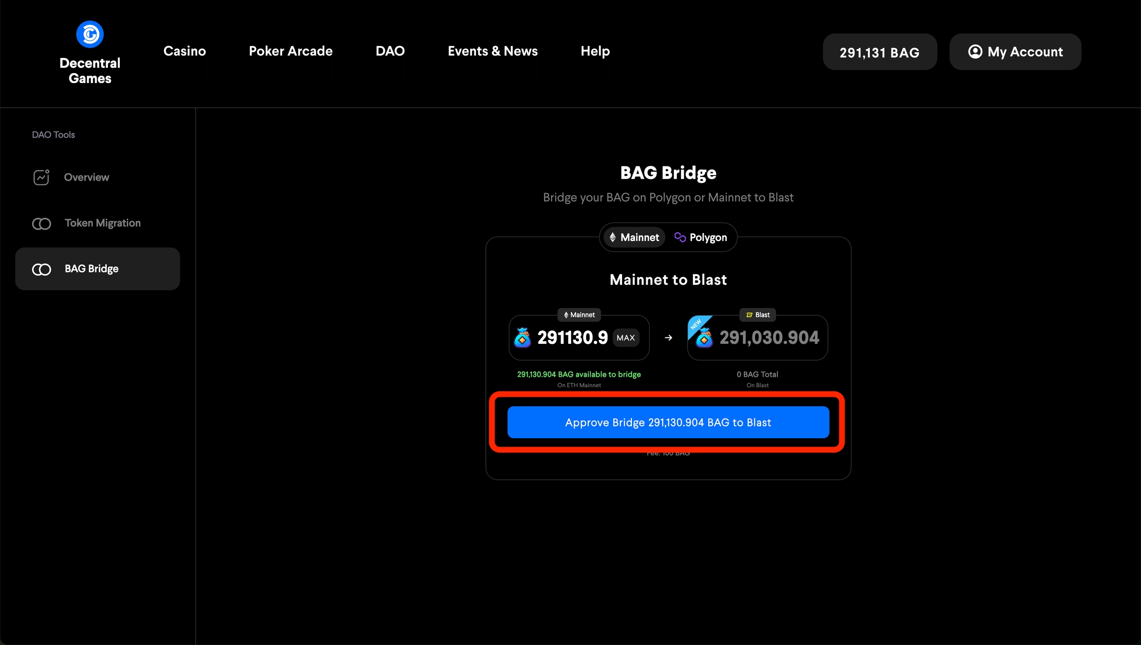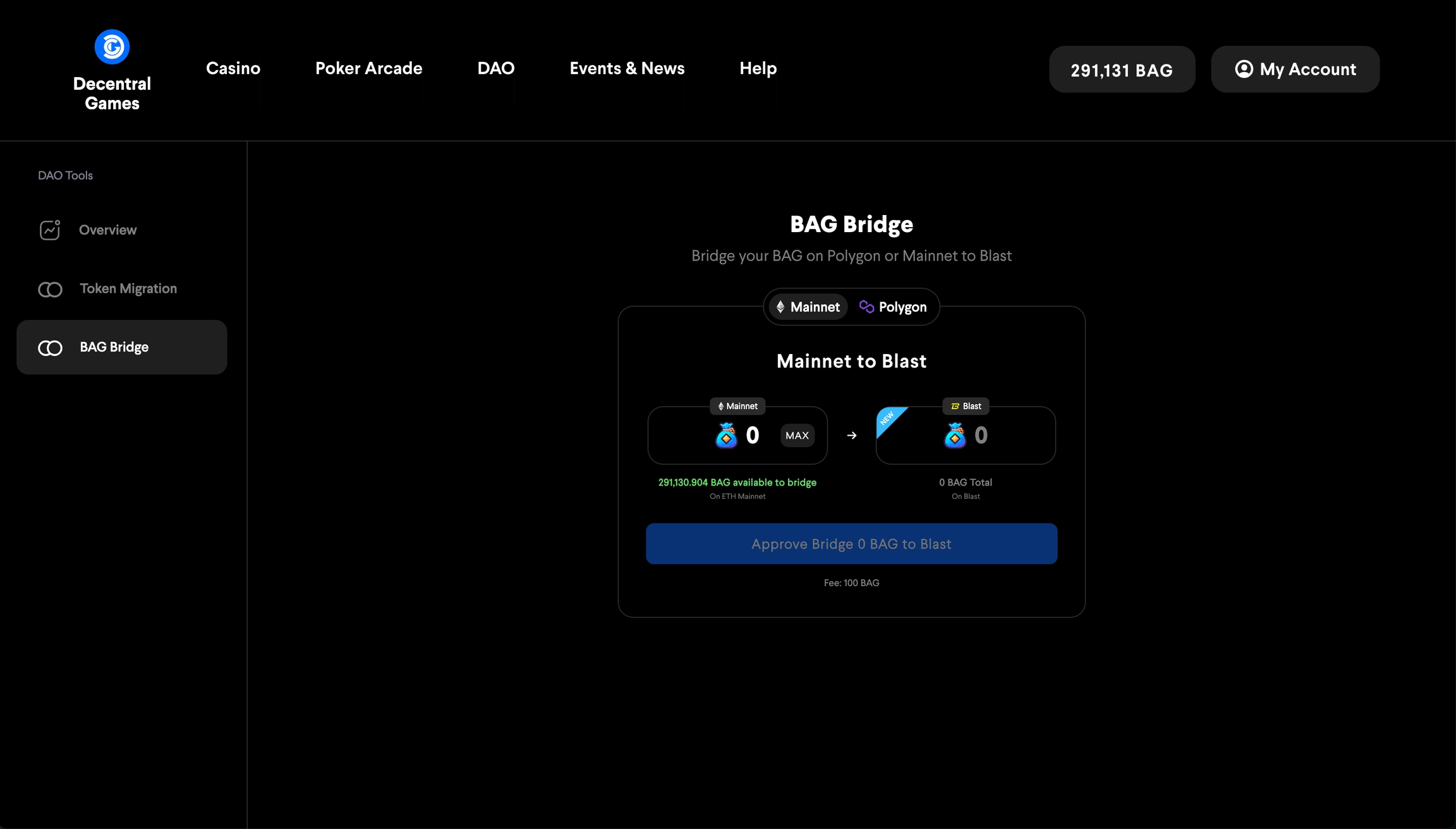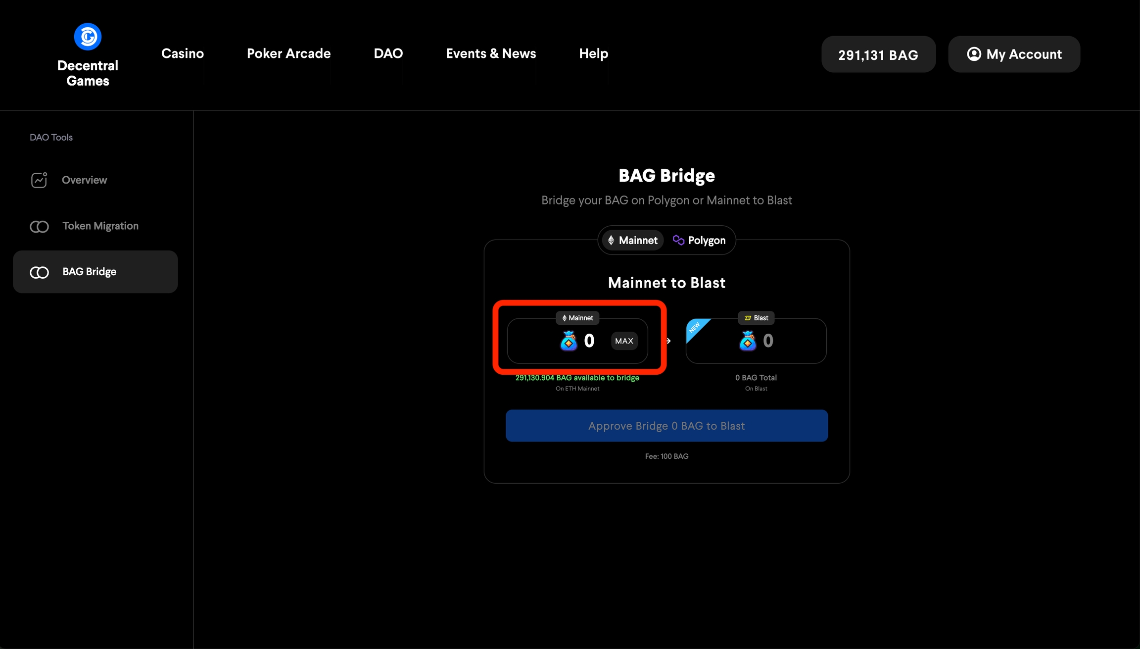 Puedes usar el puente BAG para transferir BAG desde Ethereum o Polygon a Blast.