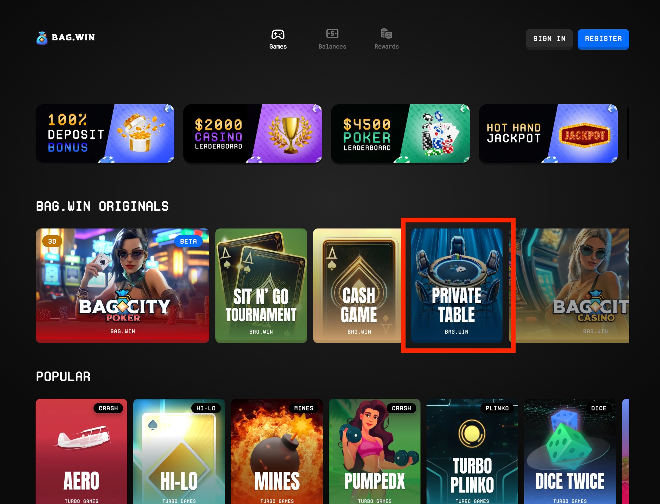 Paso 1: Inicia sesión en bag.win. En la página de inicio, selecciona Mesas Privadas.