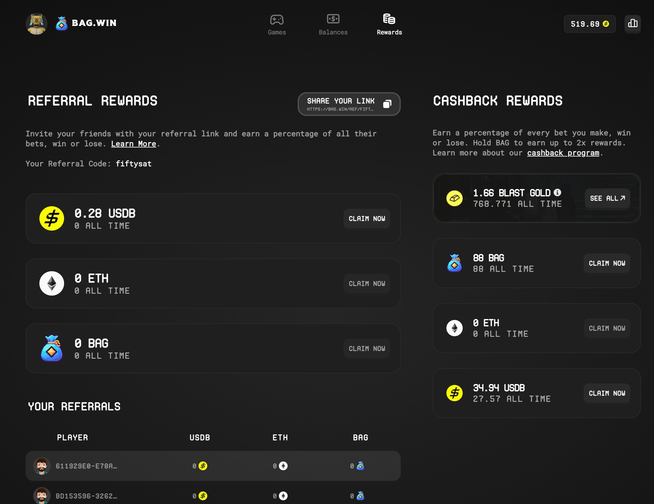 Paso 6: Puedes claimear tus recompensas de anfitrión en la sección Recompensas de bag.win.