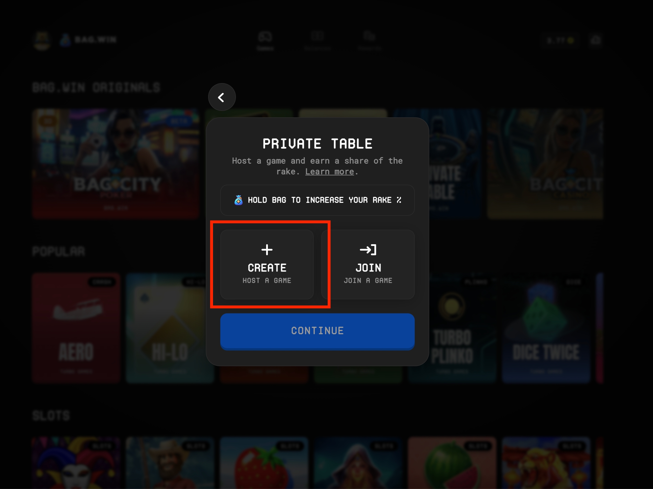 Debajo están los pasos para ser anfitrión de una mesa cash privada en bag.win. También puedes ver nuestro video tutorial.