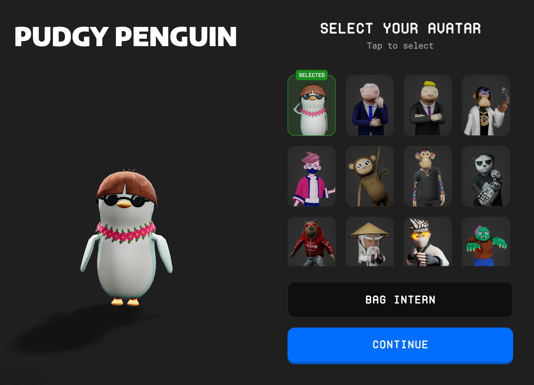 Entra al casino como Pudgy Penguin, Dogwifhat, Pepe, Mog, y mucho más. Tu avatar seleccionado aparecerá en Bag City y en las mesas de poker 2D.