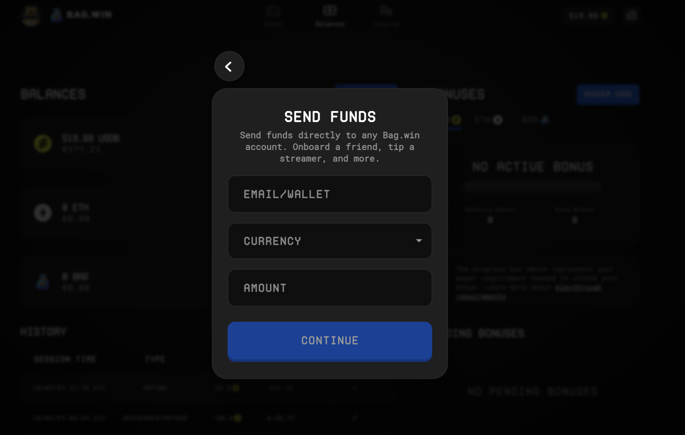 <figure><img src="https://225658112-files.gitbook.io/~/files/v0/b/gitbook-x-prod.appspot.com/o/spaces%2FAGRVwdO1ZICbrQy2gQBP%2Fuploads%2Fha53CN3PDzyX1I4RkQDq%2Fbag-win-send-funds-modal.png?alt=media&#x26;token=3ff05ef8-b5bb-476a-8aaa-4992a4366cf8" alt=""><figcaption><p>Send funds to any Bag.win player</p></figcaption></figure>